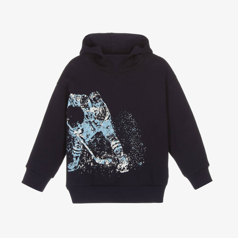 Cosy and comfy for boys, this navy blue hoodie is by luxury Italian brand Il Gufo. Made in mid-weight cotton jersey, it has ribbed trims and a warm fleecy inside. There is a blue and white ice hockey design printed on the front, with a rubberised logo badge on the hood.