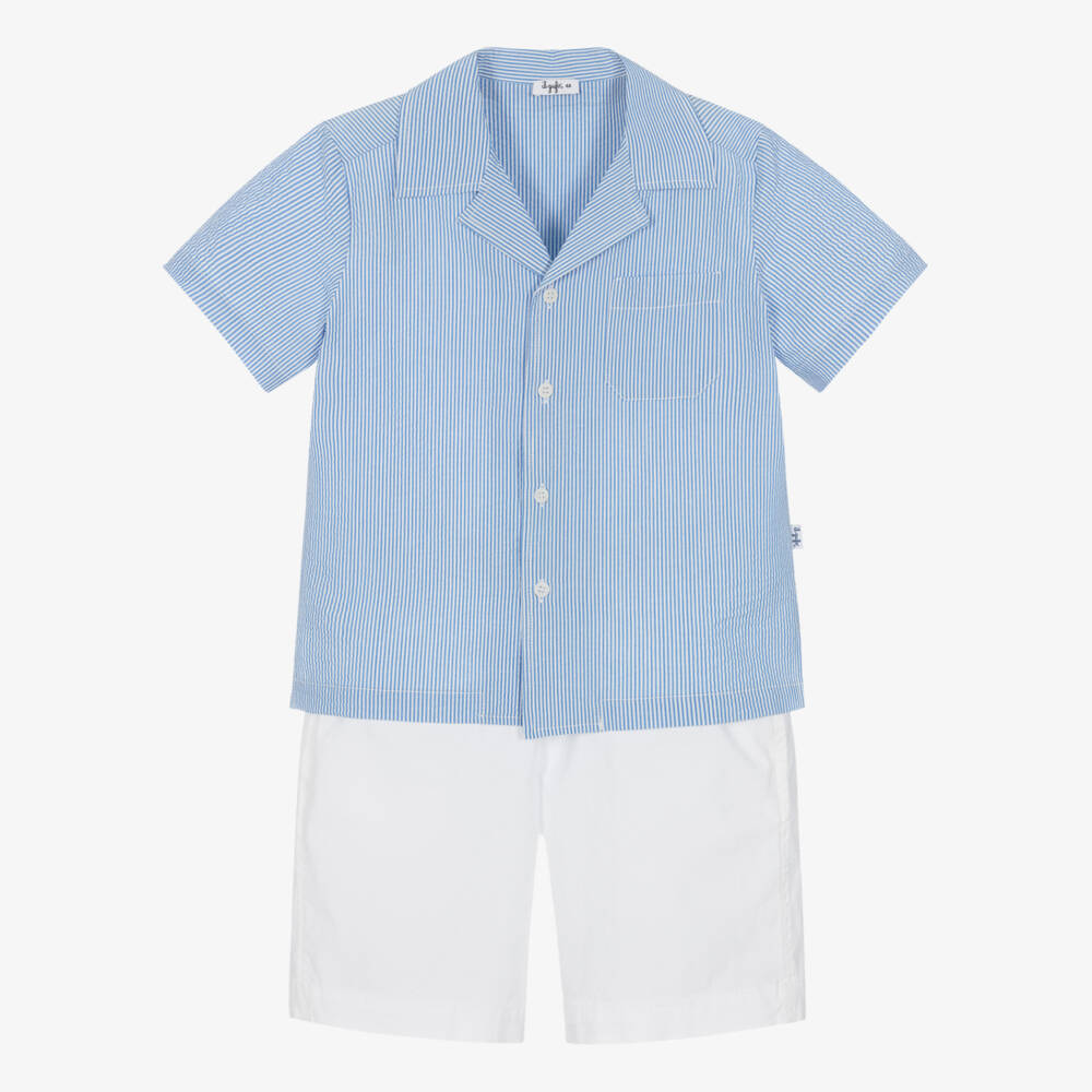 A blue and white striped shorts set for boys by luxury Italian brand Il Gufo, made from lightweight cotton. Simply styled, the button-up shirt is made from cotton seersucker with short sleeves, a revere collar, and a patch pocket on the chest. The casual shorts have useful side seam pockets, a pocket on the back, and an internal drawstring on the comfortable elasticated waist.