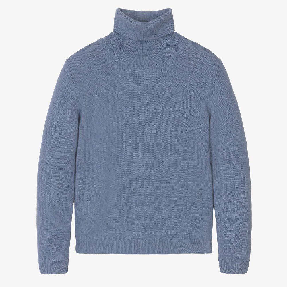 A blue roll neck sweater for boys by luxury Italian brand Il Gufo. This classic top is knitted in luxuriously soft, eco-friendly Merino wool, great for cold-weather wear.