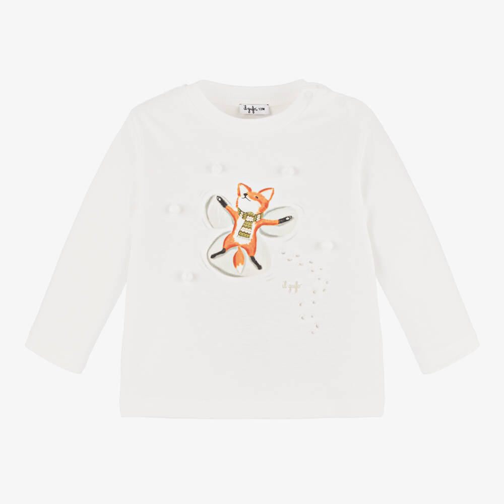 A lovely ivory long-sleeved top for little boys by luxury Italian brand, Il Gufo. Made from soft cotton jersey, there is a 'fox making a snow angel' design on the printed on the chest, featuring appliqué pom-pom snowballs, cute pawprints, and a subtle logo detail. The popper fastenings on one shoulder help make dressing easier.