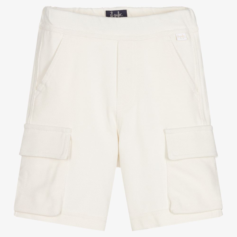 Ivory Bermuda shorts for boys, by luxury brand Il Gufo. Made from soft cotton piqué, they have cool utility-style cargo pockets, slanted front pockets, and an elasticated waist.