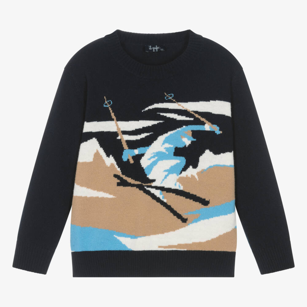 Navy blue sweater for boys from luxury Italian brand Il Gufo, made in extra fine virgin Merino wool, which is ethically sourced and environmentally friendly. Knitted for softness and a lightweight feel, this crew neck sweater has a skier on the front with a mountain scene in beige, blue and ivory. It is finished with a ribbed hem and cuffs for extra cosiness.