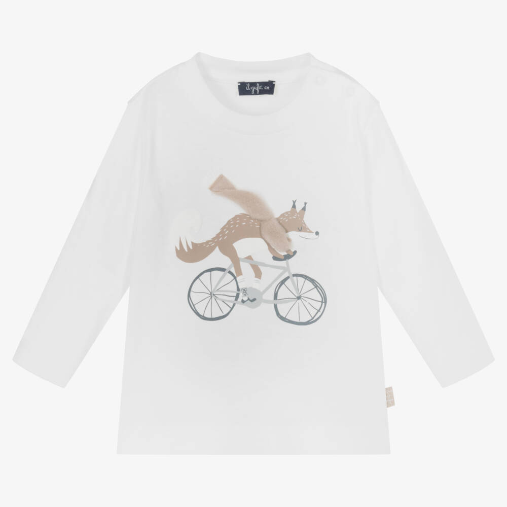 A white top for little boys by luxury brand Il Gufo, made from the softest cotton jersey. It has a sweet cycling fox print with a fluffy scarf appliqué on the front and a logo tab on the side. Smaller sizes have useful popper fastenings on one shoulder.
