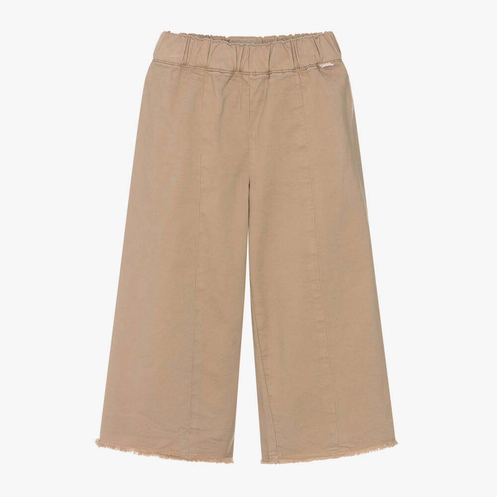Beige wide-leg trousers for girls from Il Gufo. The luxury brand has designed these beautifully soft cotton twill trousers with a white logo tab on the front and fringing on the hem for a touch of bohemian style. The waist is elasticated for comfort and ease of dressing.
