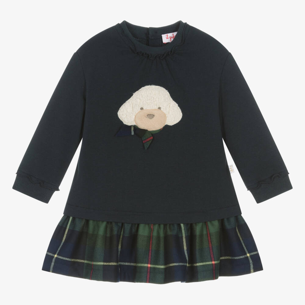 A lovely navy blue dress for little girls by luxury Italian brand Il Gufo. Made from comfortable cotton jersey, the long-sleeved bodice has decorative frilled trims on the ribbed neckline and cuffs. There is a cute dog motif appliquéd on the front, made from textured bouclé and tonal button fastenings on the back. Made to look like two pieces, the twill tartan skirt incorporates shades of red, yellow and green and adds an extra touch of charm.
