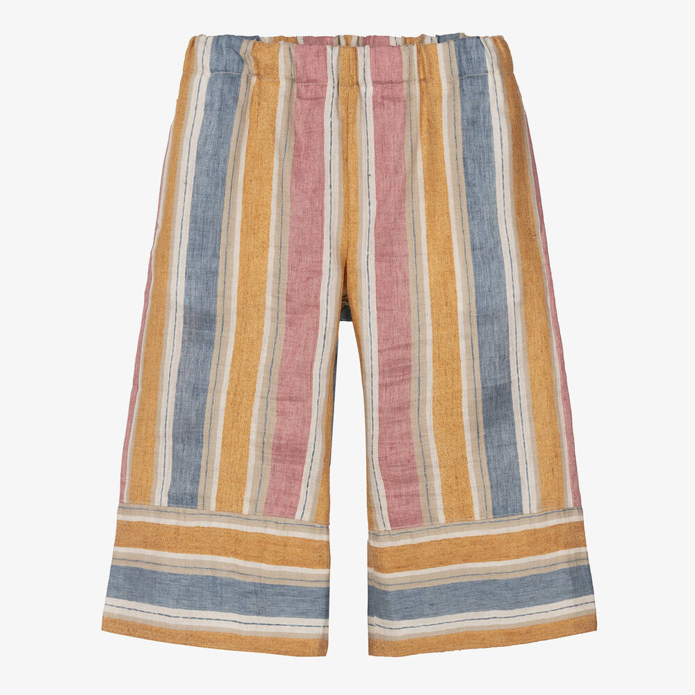 Striped culottes for girls by luxury Italian brand Il Gufo, in gold, pink and blue. Made in a lightweight linen blend, they are gently elasticated at the waist for a comfortable fit and easy pull-on.