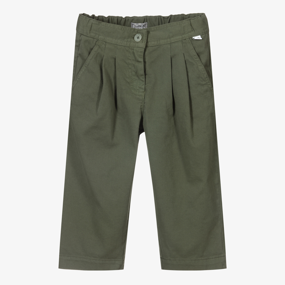 Girls khaki green, wide-leg trousers from Italian brand Il Gufo. They are made in soft cotton twill, with pleats on the front. They have slanted side pockets and a partly elasticated waistband.