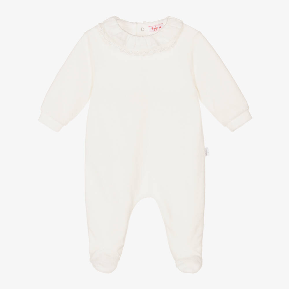 A charming ivory babygrow for girls by luxury Italian brand Il Gufo, made in soft cotton velour. Simply styled, it has a ruffled lace-trimmed collar, with popper fastenings on the back for effortless dressing.
