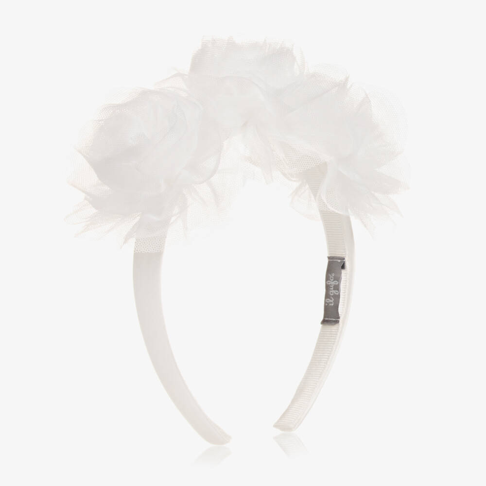 Stunning for special occasions, this ivory hairband for girls is from Italian brand Il Gufo. The flexible band is covered in a luxurious silk-blend fabric, with beautiful tulle flowers decorated on the top.