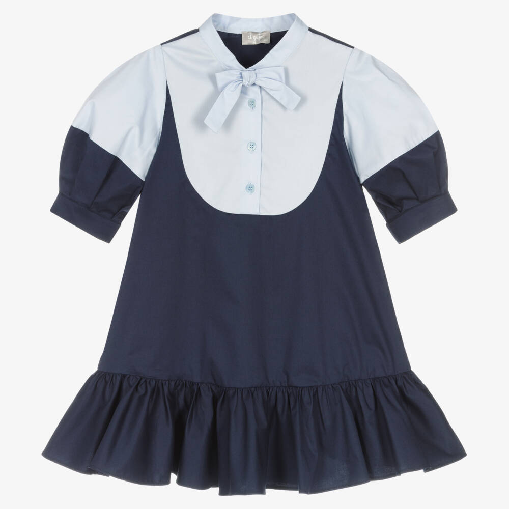 Smart casual navy blue cotton dress for girls by luxury, classic Italian designer Il Gufo. Made in lightweight poplin, it has a pale blue bib front with a fixed bow and logo button fastenings. The voluminous bubble sleeves are pleated around the cuffs and the hemline has a deep frill.