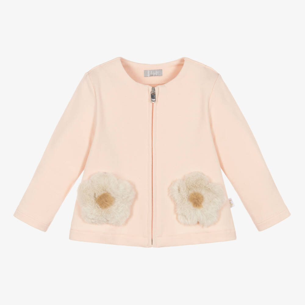 Sweet pale pink zip-up top for little girls by luxury Italian brand Il Gufo, made in soft, stretchy cotton blend jersey. It fastens with a branded zip for easy dressing and has two faux fur flower appliqués on the front for a sweet finish.