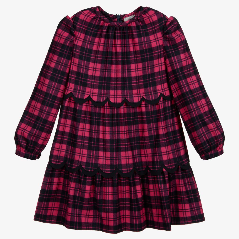 Lovely pink and navy blue check dress for girls by luxury Italian brand, Il Gufo. Made from soft, lightweight polyester, with a brushed feel, it has a tiered skirt with scalloped trims.