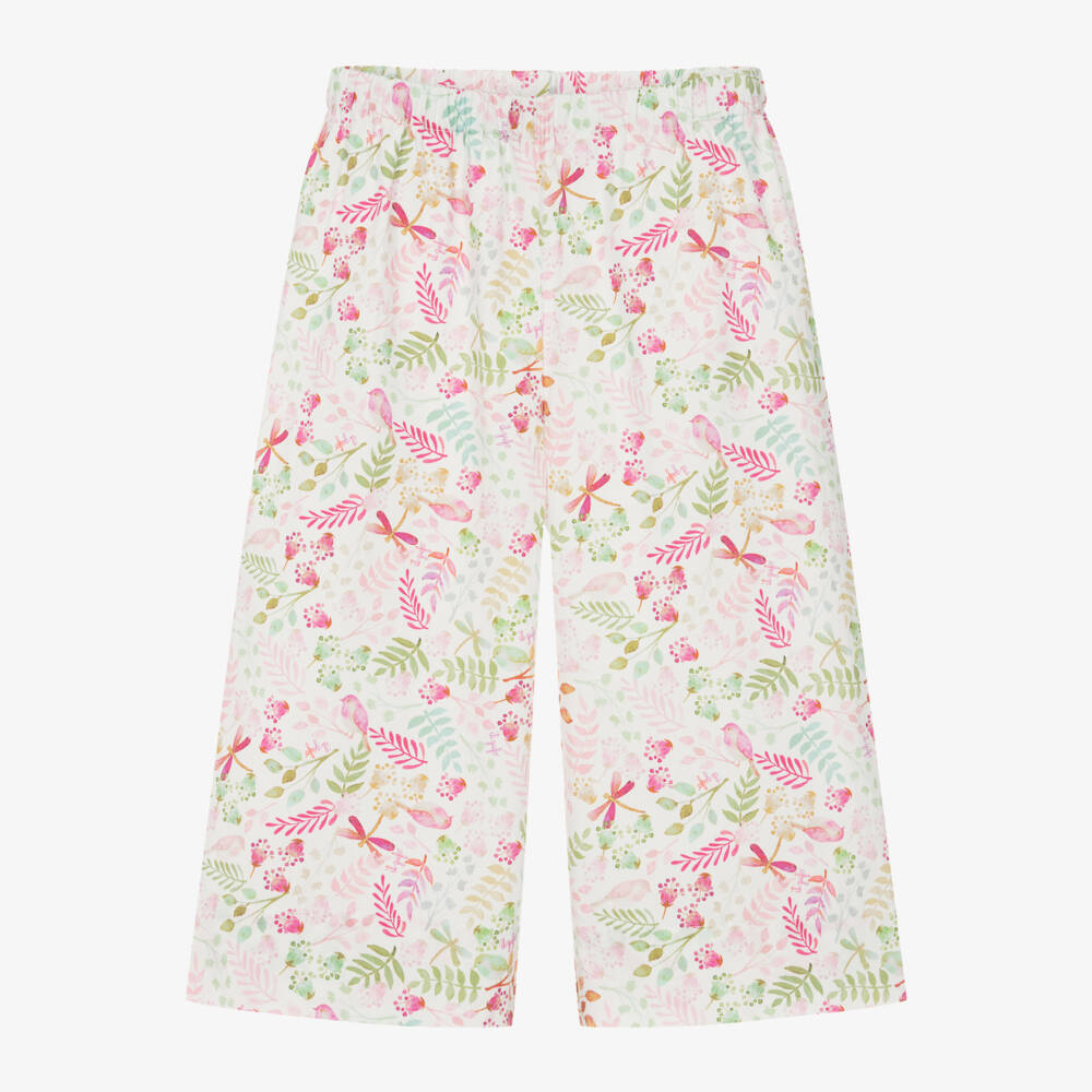 Casual wide-leg trousers for girls by luxury Italian brand Il Gufo, patterned with lovely florals, dragonflies, birds and tiny logos in pink and green. Comfortable and lightweight, they are made from white cotton poplin with an elasticated waistband for easy pull-on.