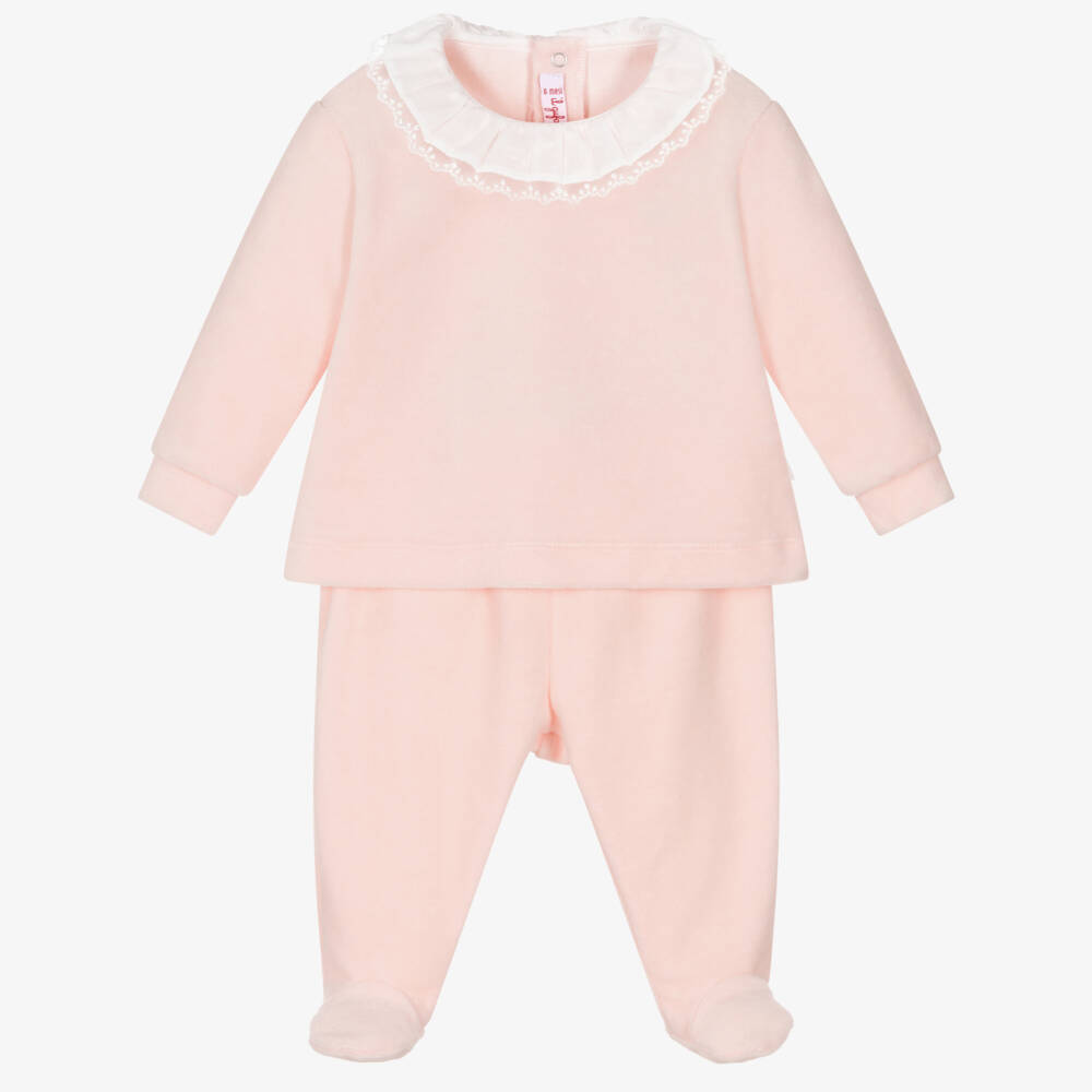 A pale pink two piece babygrow for girls, by luxury Italian brand Il Gufo. Made in super soft cotton-blend velour, this delightful babygrow has a ruffled lace-trimmed collar. There are useful popper fastenings on the back of the top and gentle elasticated trims on the bottoms.