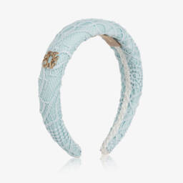 Beautiful headband for girls by Italian brand Il Gufo, with a pink, blue and green floral pattern on a white background. Made in soft and lightweight cotton, it has a stylish twist design at the front and is gently elasticated around the back for a comfortable fit.