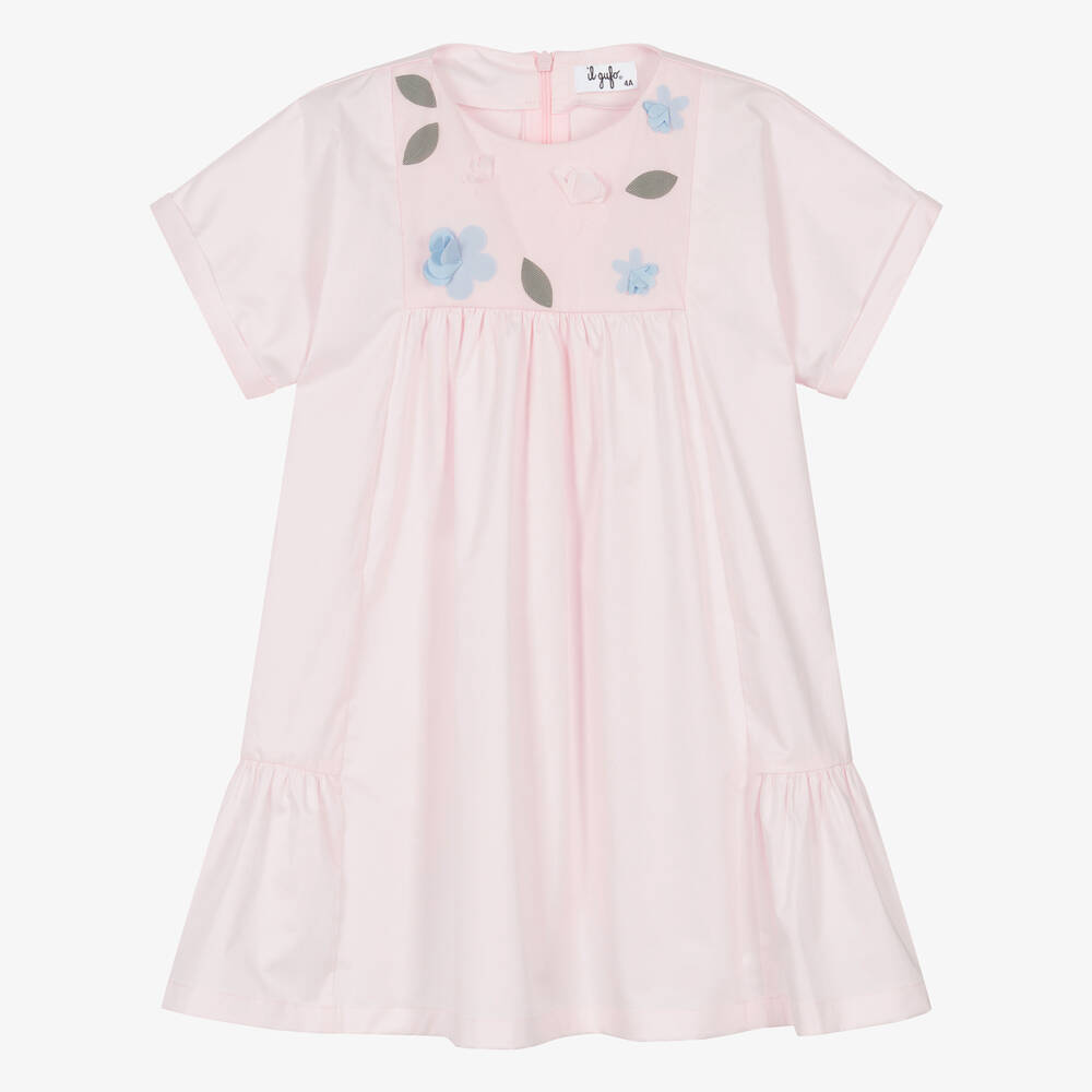 Lightweight pink cotton poplin dress for girls from Il Gufo. Luxuriously soft, it has short sleeves with turn-ups and an elegant square-shaped yoke that is decorated with handmade appliqués of blue flowers and green leaves, overlayed with pink tulle. This lovely design is gathered on the bodice, sides and back, creating pretty ruffles for a sweet look. The zip fastening on the back is concealed for neatness.