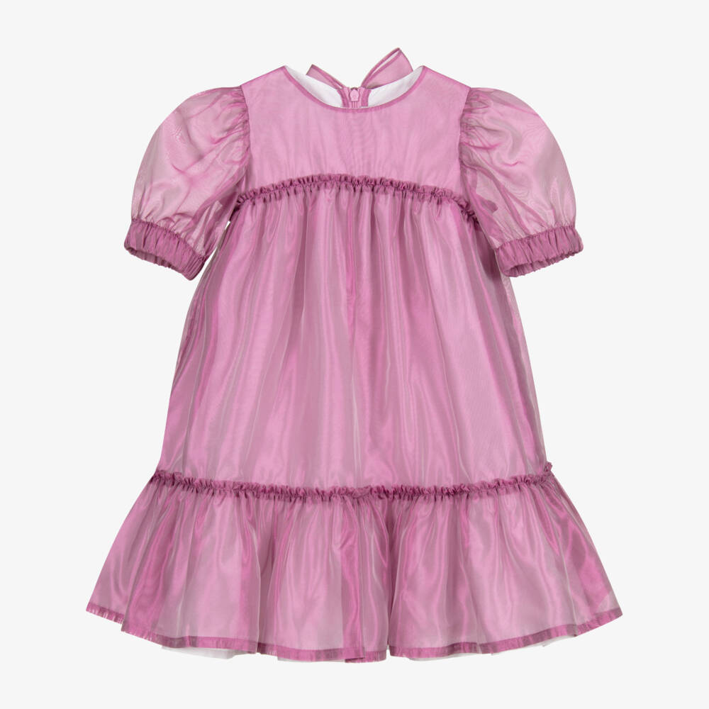 A pretty purple party dress for girls by Il Gufo. It is made in sheer silk blend and has a soft cotton lining. The hemline is frilled and the puffed sleeves have elasticated cuffs. There is a concealed zip fastening and bow detail on the back.
