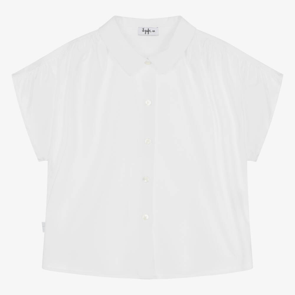 Smart white blouse for girls by luxury Italian brand Il Gufo, made in soft, smooth poplin. It has a square, boxy style, with short sleeves and pleats along the shoulders. There is a small pointed collar, front button fastenings and a white and glittery silver logo tab on one side seam for a discreet designer finish.