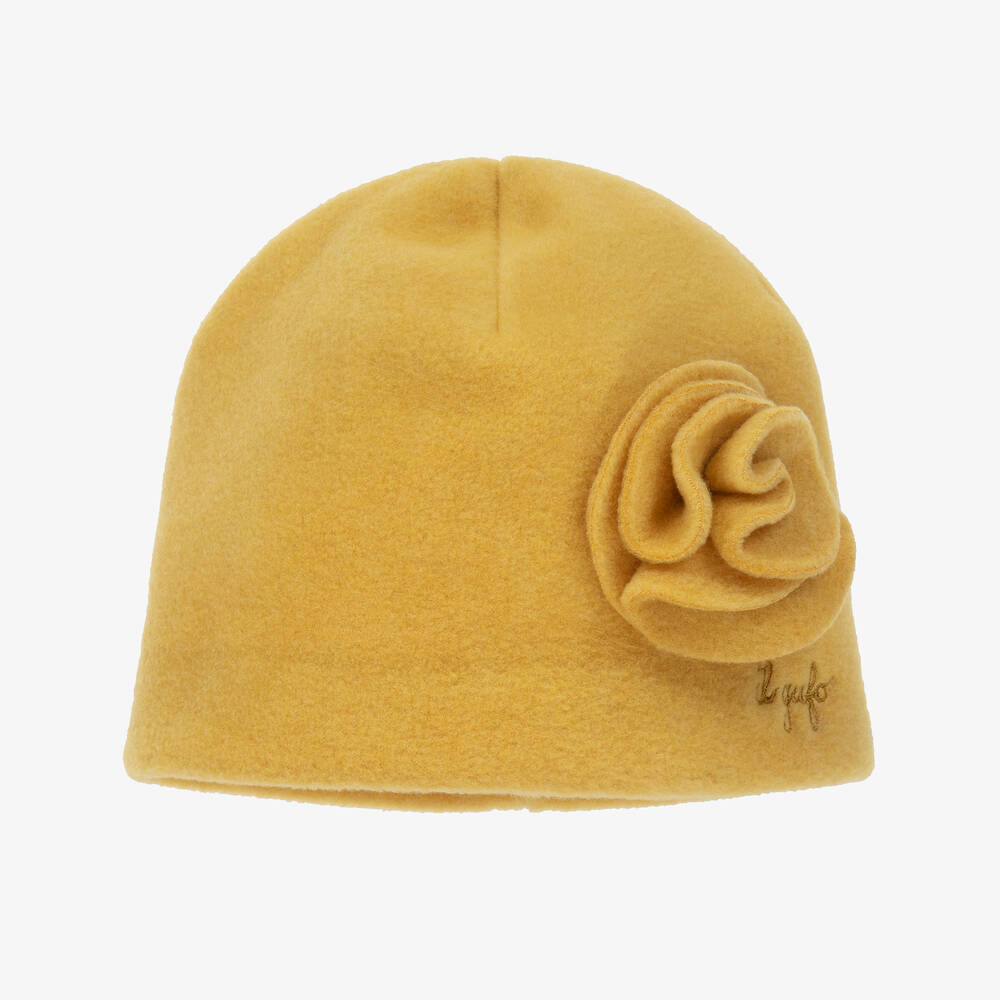Ochre yellow, super soft fleece beanie hat for girls by luxury Italian brand Il Gufo. It has a 3D flower appliqué on the front above the embroidered logo.