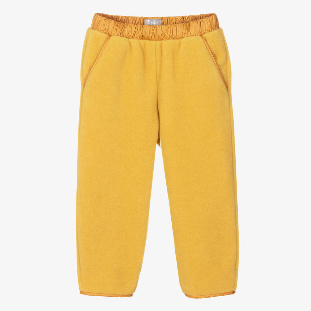 Mustard yellow joggers for girls by luxury Italian brand Il Gufo, made in super soft fleece. Warm and cosy, these joggers have contrasting silky trims on the slanted front pockets and cuffs. They have a matching silky elasticated waistband.