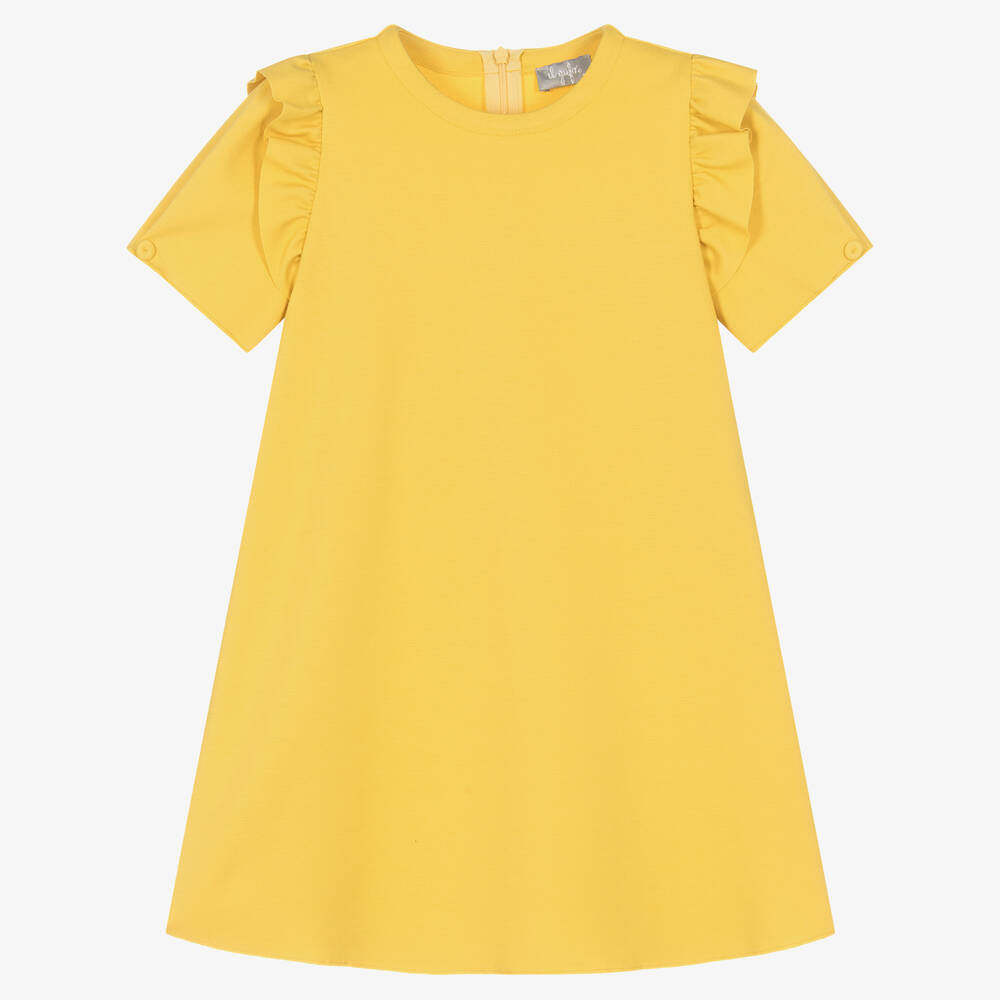 Smart yellow dress for girls by luxury Italian brand Il Gufo, with frills over the shoulders and a button on the pleated sleeves. Made in comfortable Milano viscose jersey, it has a raw edged hem and a concealed zip fastening on the back.