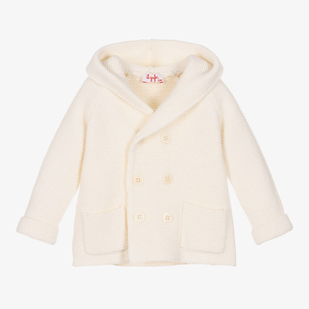 A ivory cardigan for little boys and girls, by luxury Italian brand Il Gufo. Knitted in the softest Merino wool, this sweet cardigan has a cosy hood with a pom pom on the top. It fastens neatly with buttons and has patch pockets on the front.