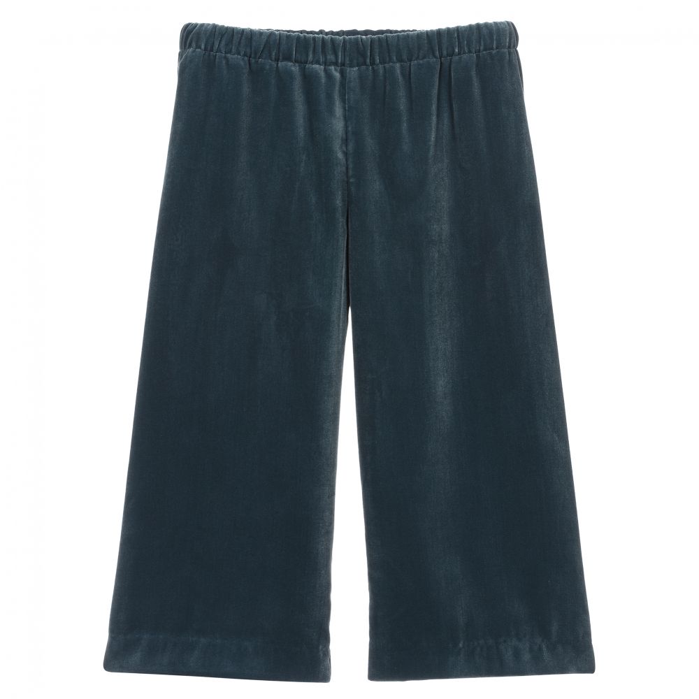 Girls teal grey velvet wide leg trousers by Il Gufo. Super soft and comfortable to wear, they have an elasticated waistband.