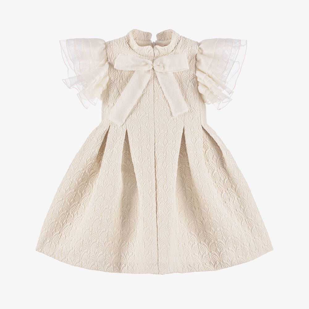 Elegant ivory jacquard dress for girls by Irpa, woven with shimmery metallic gold accents and highlighted by a large bow on the front. Styled with delicate ruffle sleeves and a full box-pleated skirt, this charming dress is ideal for special occasions. Fastening with a concealed zip, it is fully lined for comfort, with a stiffened tulle hem creating a beautifully full silhouette.