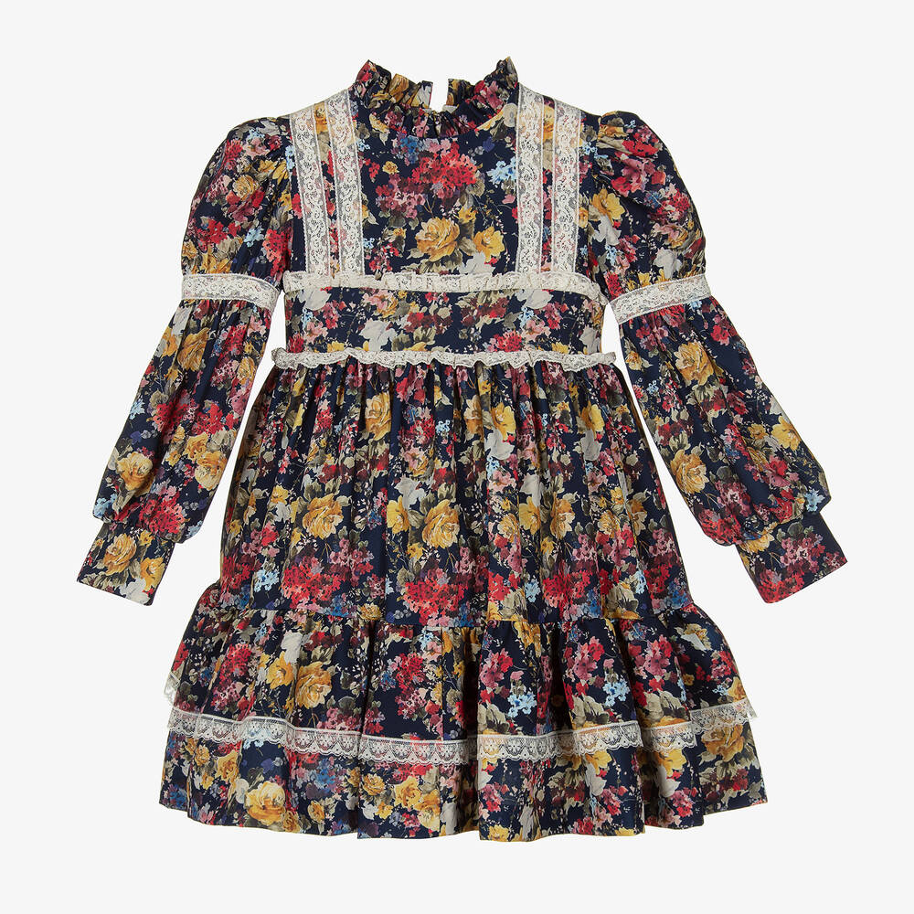 Pretty navy blue dress for girls by Irpa, made in soft, silky fabric and patterned with a colourful floral print. There is a stand-up collar and lovely ivory lace trims on the bodice, long, puffed sleeves and tiered skirt. The full cotton lining has a tulle trim providing added volume to the skirt and it fastens with a concealed zip on the back.