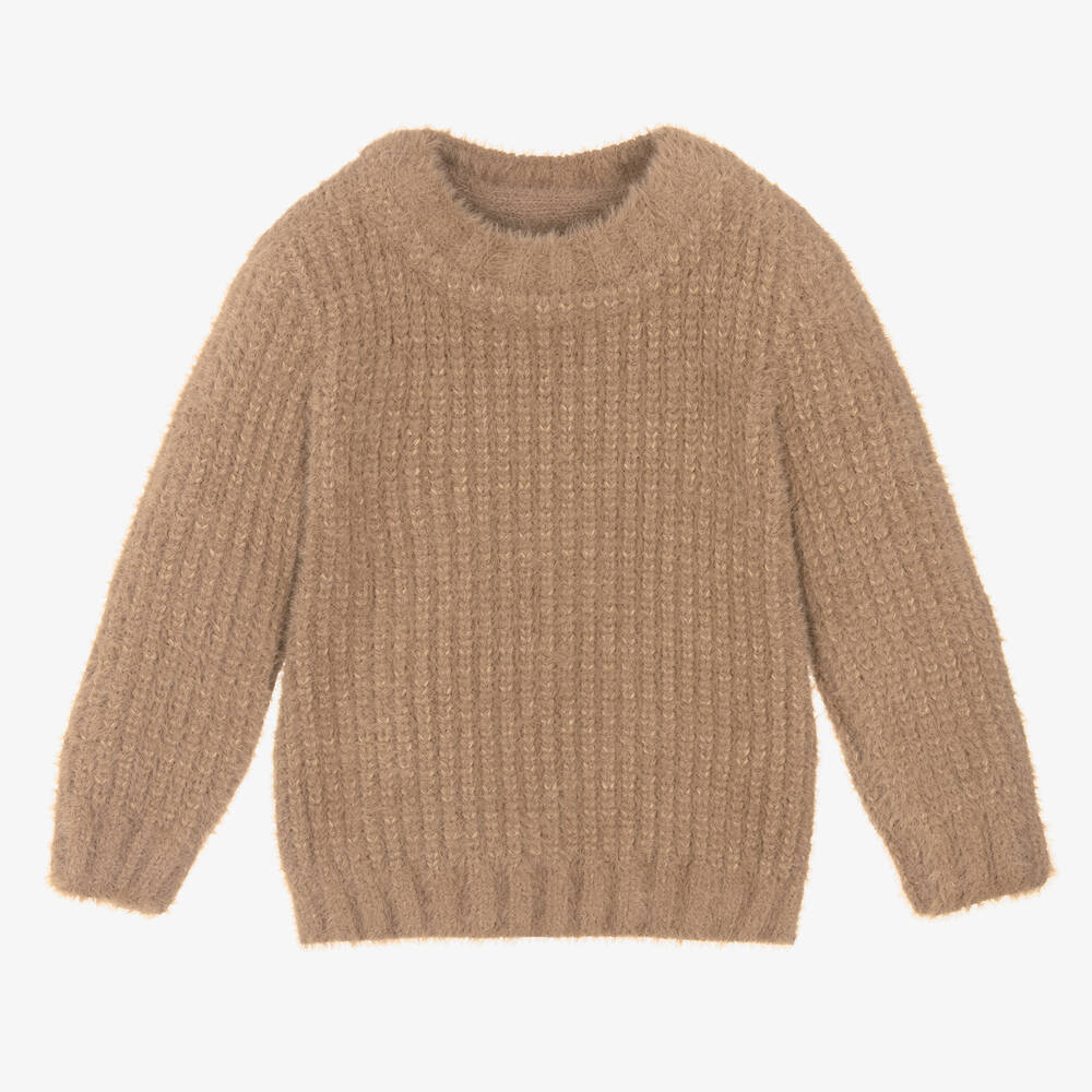 Cosy brown sweater for baby boys by Jamiks, knitted in a fluffy wool and cashmere blend. Lovely for layering on colder days, it has a crew neckline and stretchy ribbed trims.