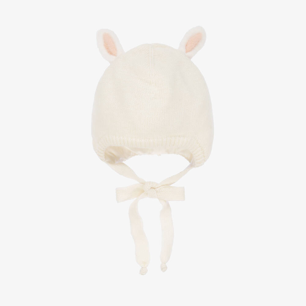 An adorable ivory hat for baby girls by Polish brand Jamiks, with fleecy pink and white bunny ears. Cosy and warm, it is knitted in a luxuriously soft wool and cashmere blend. It has a lightweight cotton jersey lining and secures with knitted ties under the chin.