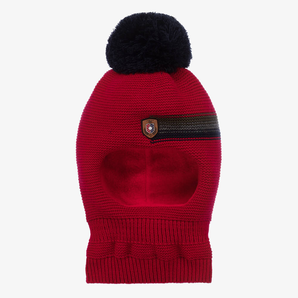 A red balaclava for boys from Jamiks, with a navy blue pom-pom on the top. It is so cosy and comfortable thanks to the softly knitted fabric and cotton fleece lining. A metal crest logo on the front and jacquard stripes to one side in green and blue give this accessory a cool, preppy feel.