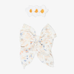 A pretty ivory skirt set for girls by Jamiks, made in soft and comfortable organic cotton cheesecloth. Ideal for wearing at the beach or around the pool, both pieces are trimmed with ruffles and pull on easily over swimwear. The top has a tie fastening on the back and the full skirt has a gently elasticated waistband.