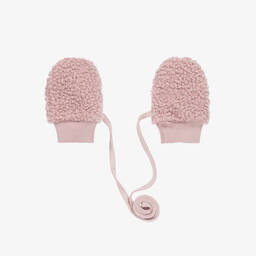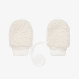Ivory bouclé mittens for baby boys and girls from Jamiks. The beautifully soft ribbed cuffs and cotton jersey lining ensure they fit comfortably on tiny hands. The attached strap threads through the sleeves of their coat or jacket to keep the mittens safely together.