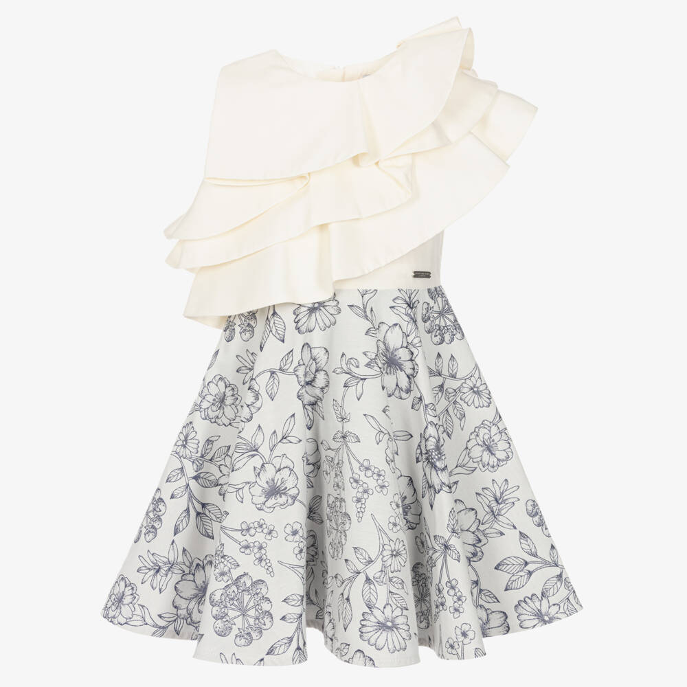 An occasion dress for girls from Jessie and James London, in ivory and navy blue. A design in the British brand's iconic style, this softly woven dress is layered with asymmetric ruffles on the cotton bodice for a truly elegant, stand-out look. Intricately woven within the fabric of the skirt are romantic flowers in Toile de Jouy style for a nostalgic look. Fastening on the back are a hidden zip and brown logo-embossed button, adding a signature designer detail. It has a comfortable cotton lining and a silver-tone logo plate on the waist.