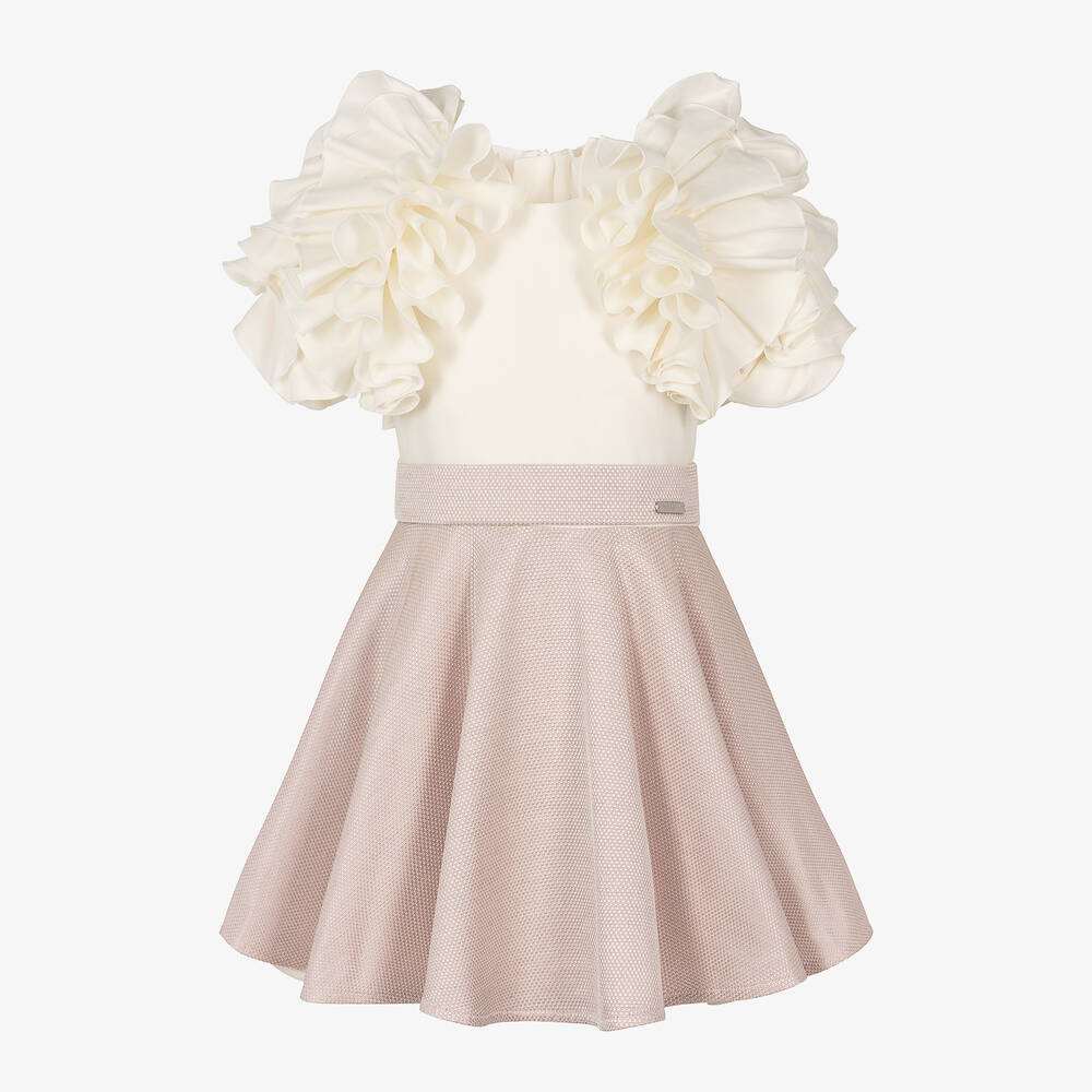 A stunning ivory and lilac purple dress for girls by Jessie and James London, ideal for a special occasion. Designed with an ivory twill bodice, the dress is defined by its fabulous oversized ruffle sleeves. Woven with a lovely shimmer, the flared skirt has a fixed belt above, trimmed with a branded metal tag for a discreet designer detail. The dress is comfortably lined in lightweight cotton, with a concealed zip on the back and an amber-coloured button on the skirt overwrap.