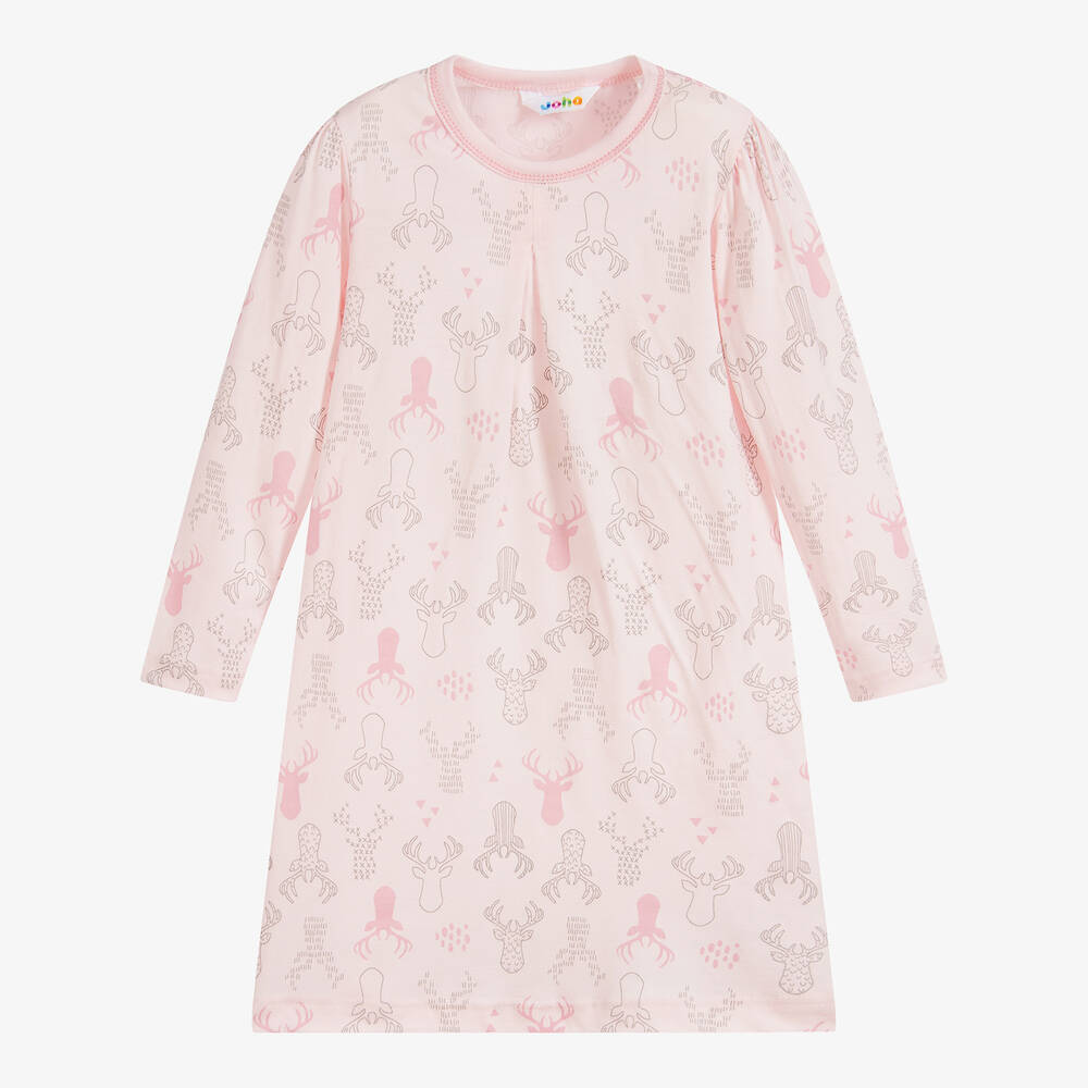 Pink thermal nightdress for girls by Joha, with a grey and pink reindeer pattern. Soft and lightweight, it is made in Merino wool jersey.