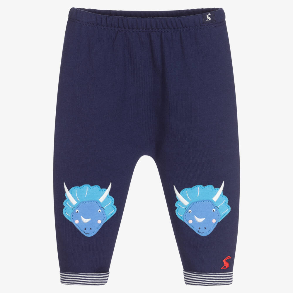 Cute navy blue trousers for baby boys by British brand Joules, made in organic cotton jersey. They have contrasting pale blue dinosaur patches on the knees with fixed, striped turn-ups and a coordinating striped patch pocket around the back. The designer's signature hare logo is embroidered in red on one leg and there is a logo tab on the elasticated waistband.