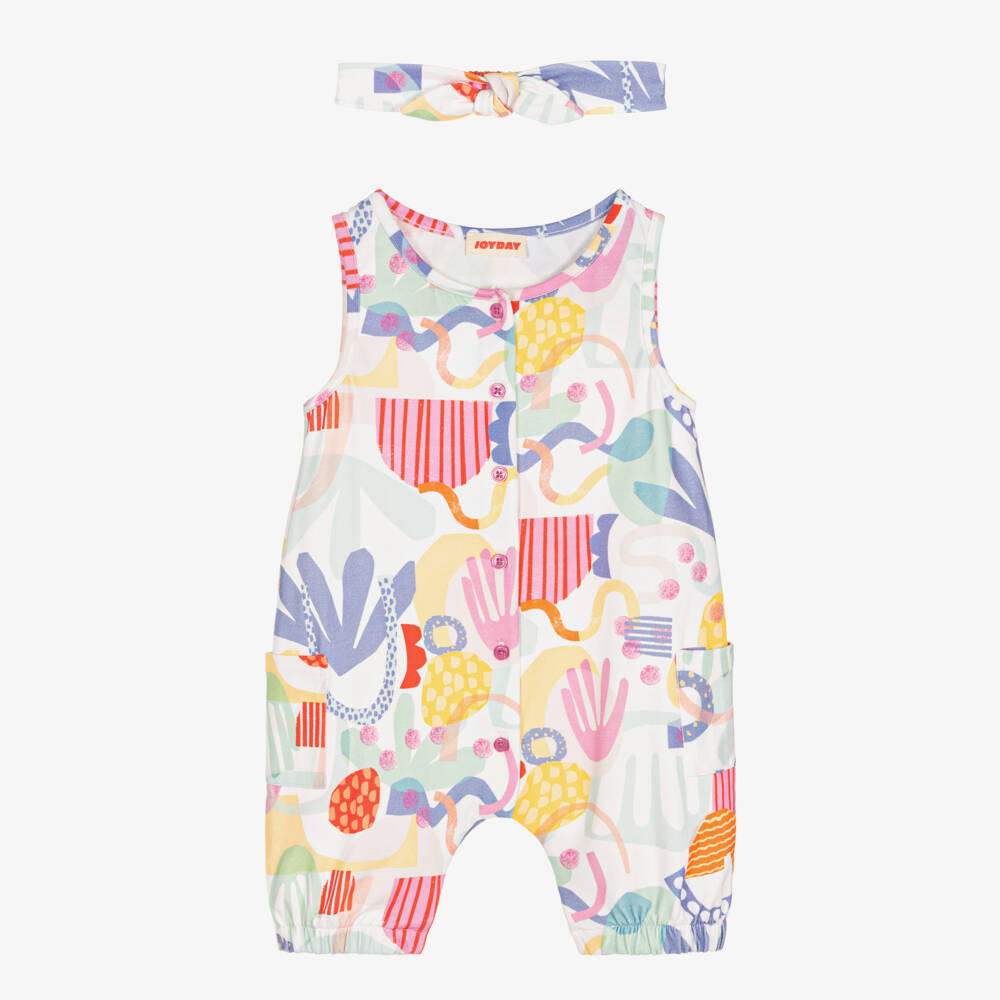 Super cute cotton playsuit set for baby girls by British brand Joyday, exclusive to Childrensalon. Made in super soft, comfortable jersey with neat, elasticated cuffs, it has a colourful abstract print in pink and blue on a white background. There are pink button fastenings on the front, with poppers between the legs for speedy changes. A matching headband completes the set, with a bow on top and an elasticated panel around the back for a good fit.