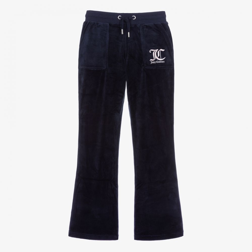 Navy blue wide leg trousers for girls by Juicy Couture, inspired by the adults collection and made in super soft velour. They have a rubberised pink logo on one of the front pockets and a drawstring waistband with silver logo eyelets and aglets. The back pockets have flaps secured with silver logo poppers.