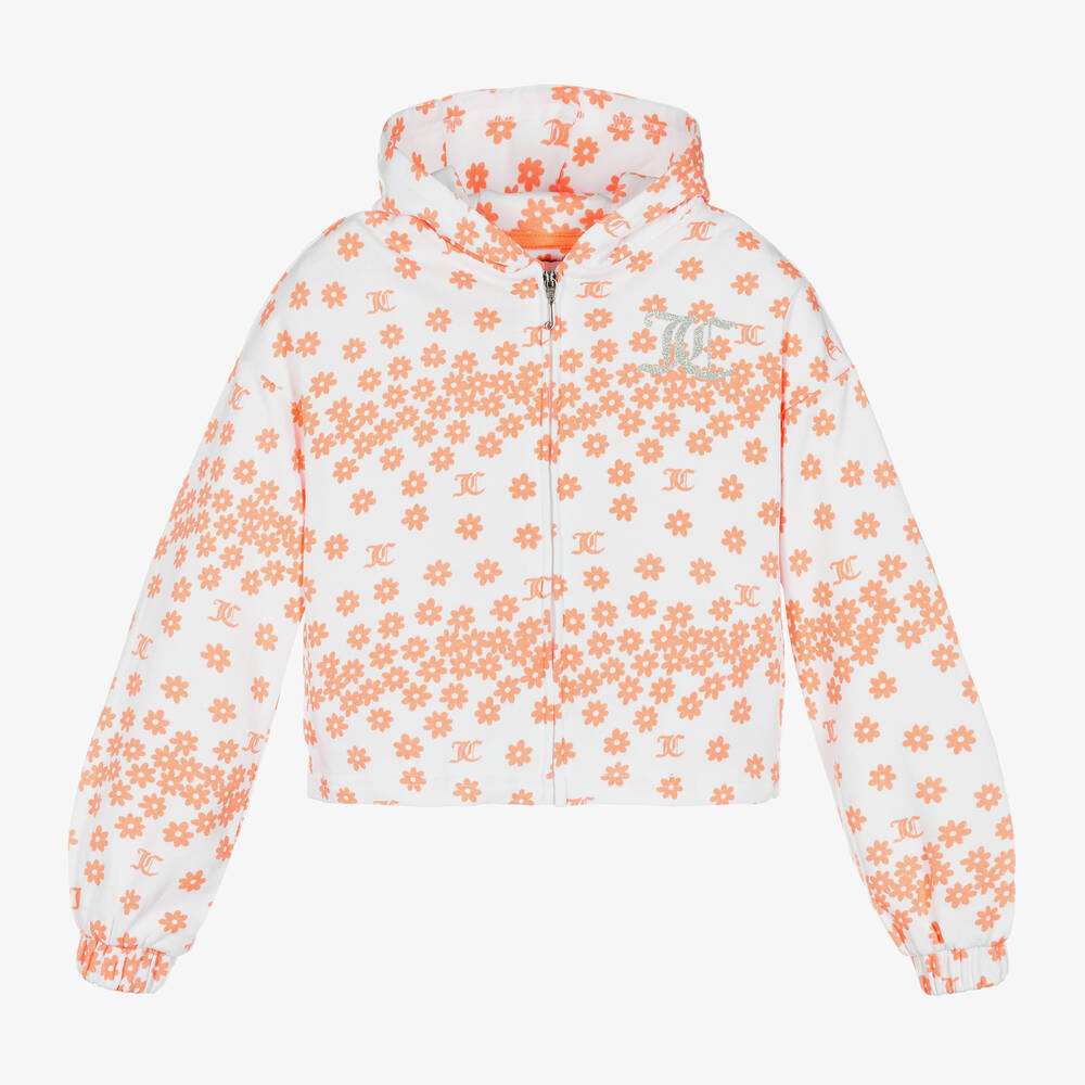 A lovely white zip-up hoodie for girls, by Juicy Couture. Casual and comforting, this cotton jersey top has elasticated cuffs and front pockets. It is patterned in a orange floral logo design, with a glittery 'JC' logo on the chest.