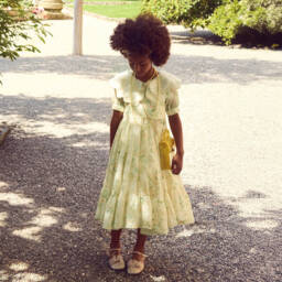 Gorgeous ivory special occasion dress for girls by Junona, made in luxuriously soft crêpe chiffon in an elegant floor length. The delicate fabric has flowers and swirls beautifully embroidered with a hint of gold thread for sparkles. It has sheer puffed sleeves and a cotton lining with layers of soft tulle in between for added volume. The brand's golden logo plate and neckties to finish into a bow complete the look.