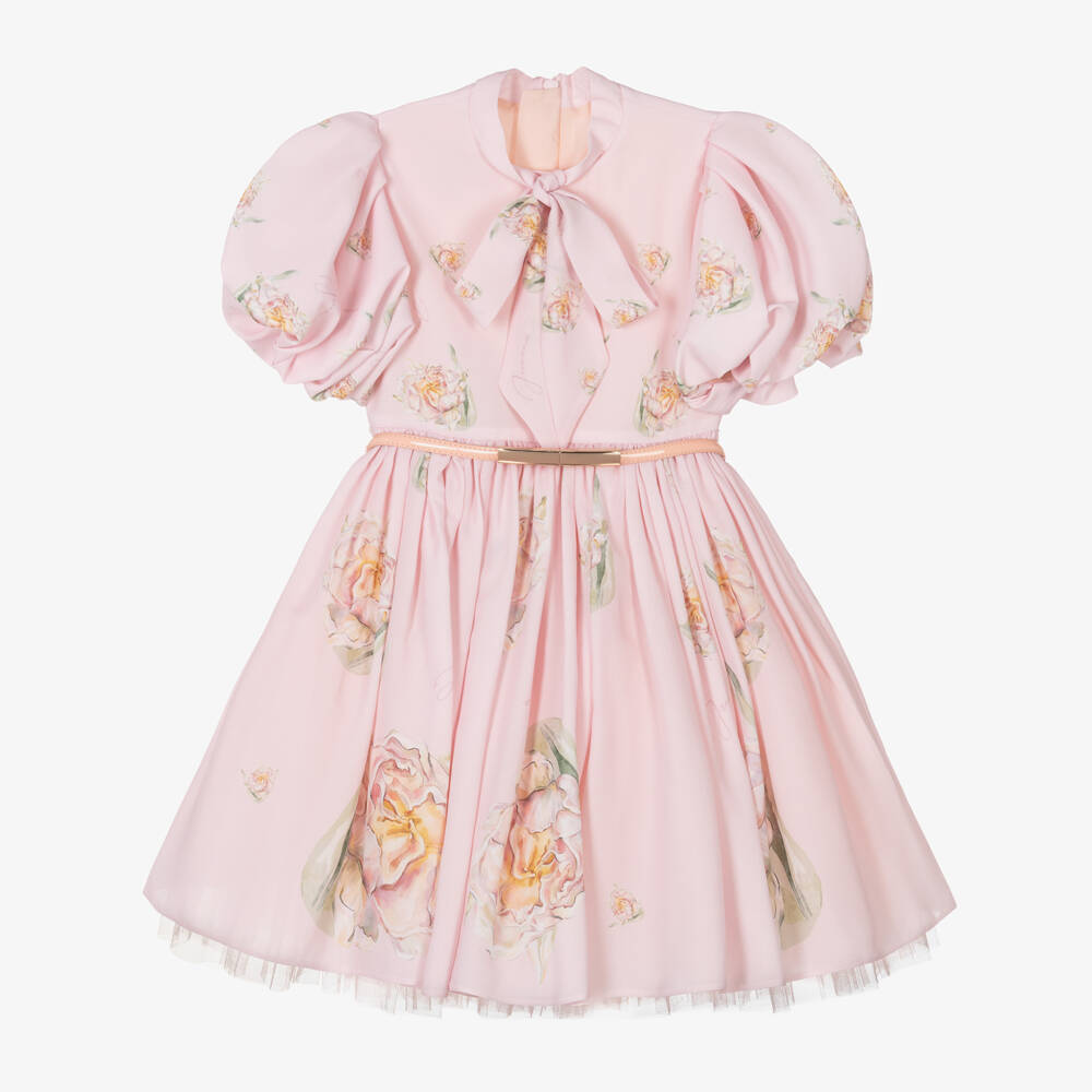 A gorgeous pink dress for girls by Junona, made from delicate crêpe with a floral logo pattern. It has a tie detail collar, puff sleeves and a full flared skirt for romantic occasionwear styling. A faux patent leather belt with a gold-tone clasp accessorises the waist and a concealed zip fastens on the back. It is lined in soft cotton voile with layers of tulle for added volume.