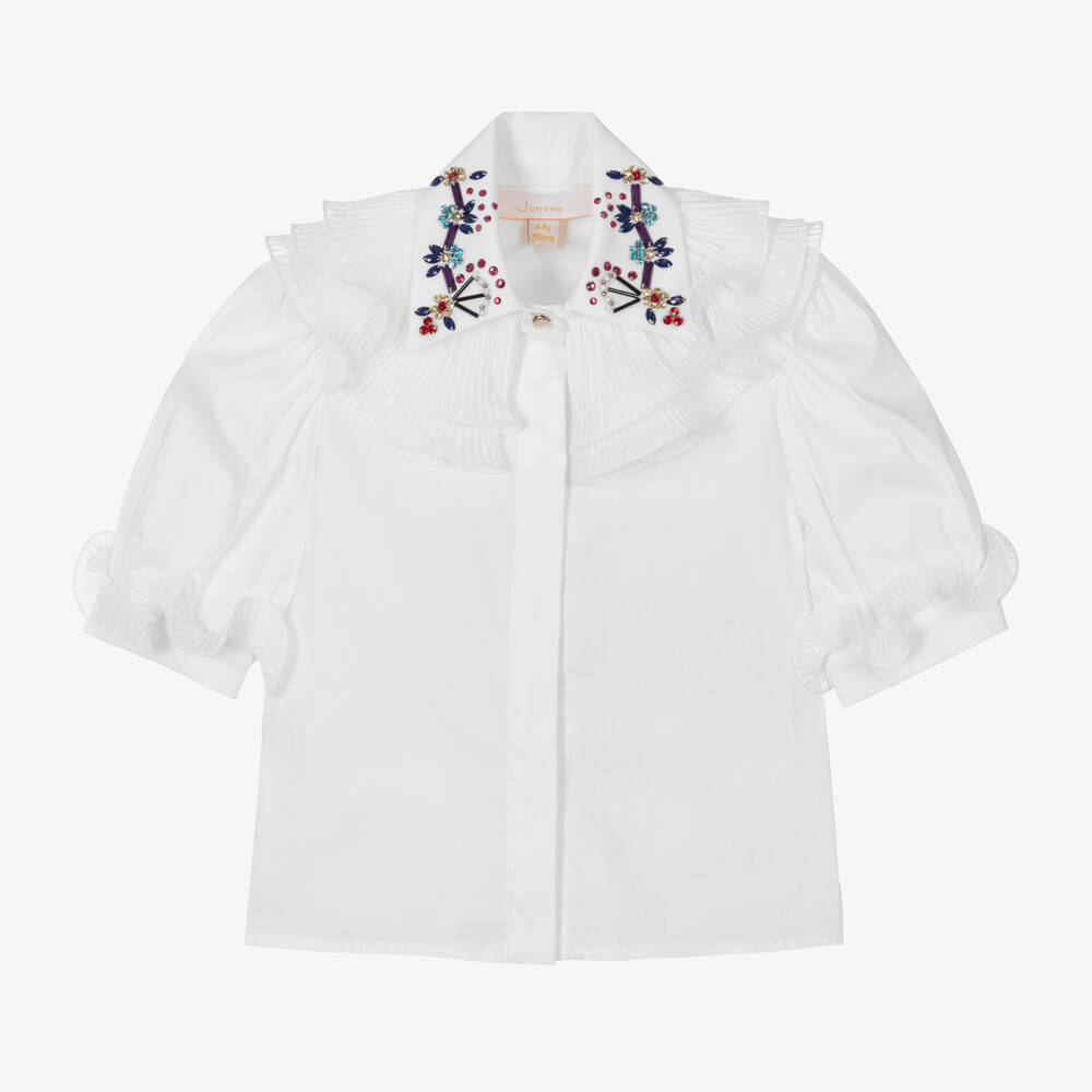 An eye-catching white blouse for girls by Junona, made from soft cotton poplin. Ideal for statement styling, it has a pointed collar decorated in colourful jewels, voluminous pleated ruffle trims and lightly puffed three-quarter-length sleeves. A gold-tone button fastens on the neck and cuffs, finished with a button-up chest placket.
