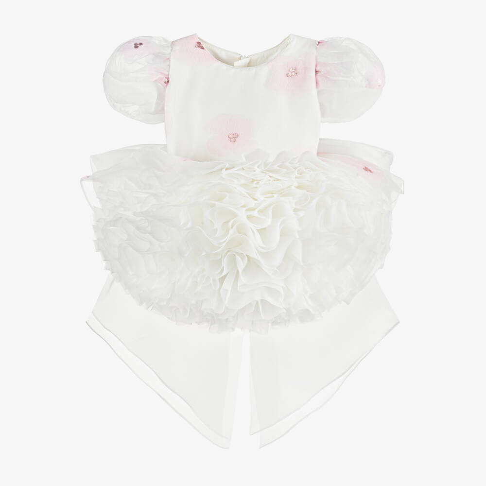 A white organza dress for little girls by Junona. Ideal for a special occasion, the dress is defined by a striking pom-pom skirt made from layers of ruffled organza with an elasticated bubble hem for added bounce. There is a pretty pink floral jacquard pattern on both the bodice and sheer puff sleeves with glitter detailing for a sparkling finish. A fabulous oversized bow on the back completes the cute look, it attaches neatly to the dress with poppers. Fully lined in lightweight cotton for comfort this gorgeous dress fastens with a concealed zip on the back.