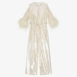 A beautiful white and pink jumpsuit for girls by Junona, ideal for a special occasion. This sleeveless design has a large pink 3D flower on the bodice and pleated wide legs for a modern look. Fully lined for comfort, it fastens with a zip on the back.