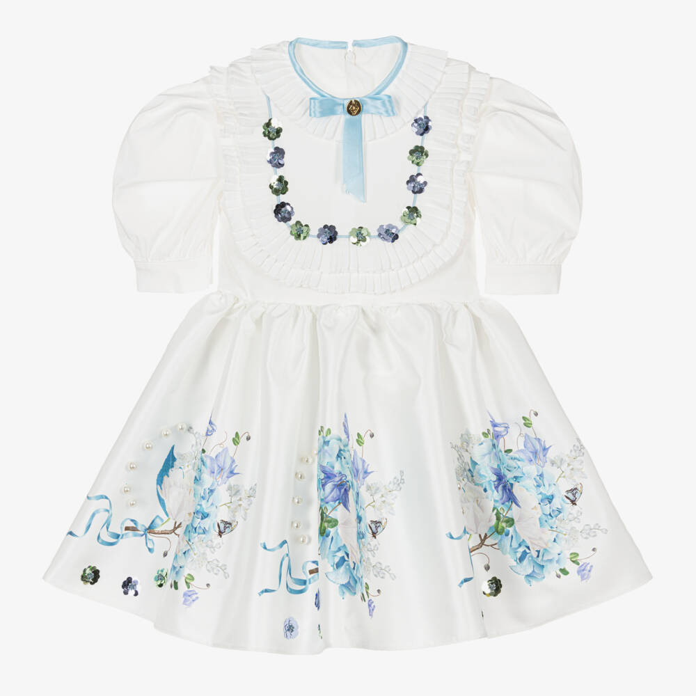 A lovely white dress for girls by Junona, printed with charming blue and white flowers on the skirt. Beautiful for occasion wear, this short-sleeved style has a softly woven cotton bodice and a satin twill skirt for contrast. The bodice is designed with a ruffled trim, decorated with pretty purple and green sequin flowers that catch the light beautifully. The narrow, light blue neckline is detailed with a gold logo charm and the skirt is embellished with elegant faux pearls. Lined with gentle cotton fabric, this dress fastens neatly on the back with a zip.