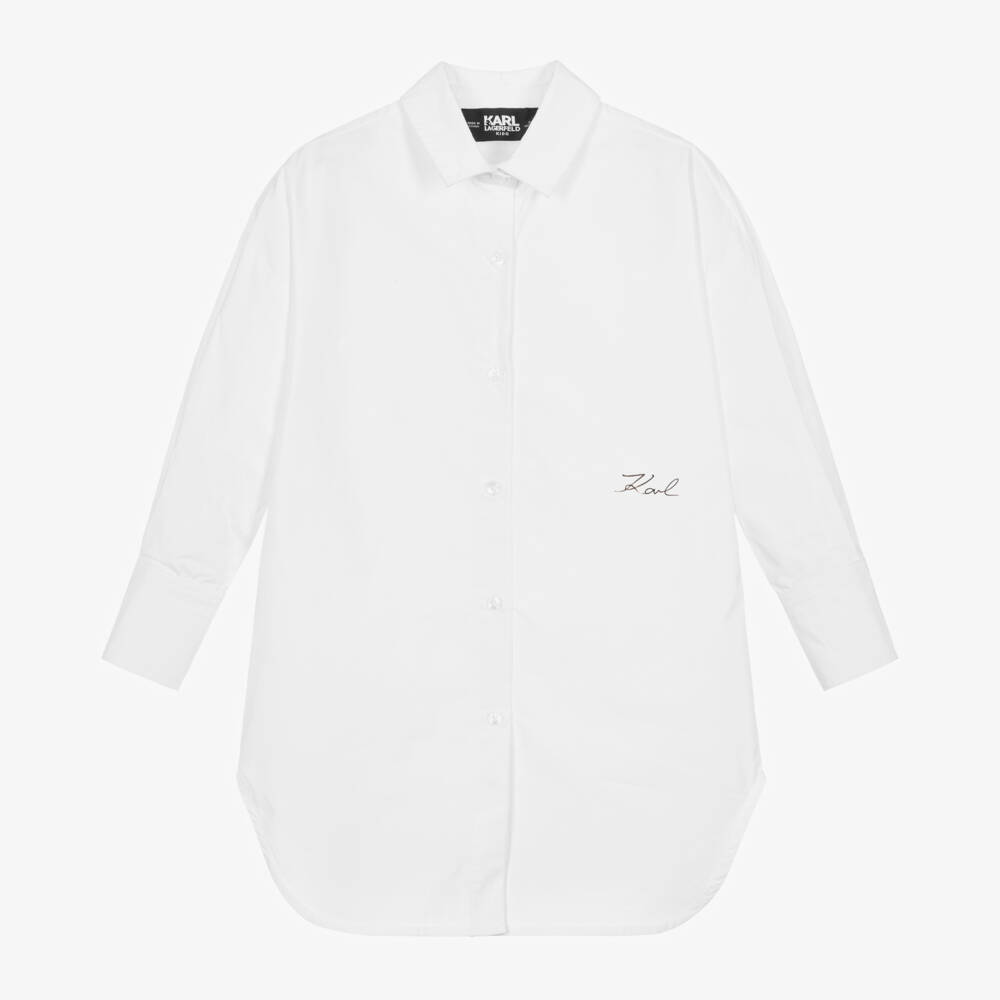 White Mini-me shirt dress for girls by KARL LAGERFELD KIDS, softly woven in cotton poplin. On the back, there is a statement gold studded logo design. A small script logo, printed in metallic gold foil, decorates the front of this contemporary piece. It is simple, contemporary and has an oversized fit. There are tonal button fastenings on the front.