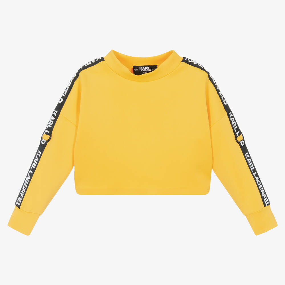 Bold and distinctive, this yellow jersey sweatshirt for girls is by KARL LAGERFELD KIDS. In a cropped fit, it has a high neck collar with grosgrain logo taping on the sleeves. The logo-embossed D-ring details add an innovative edge to this design.