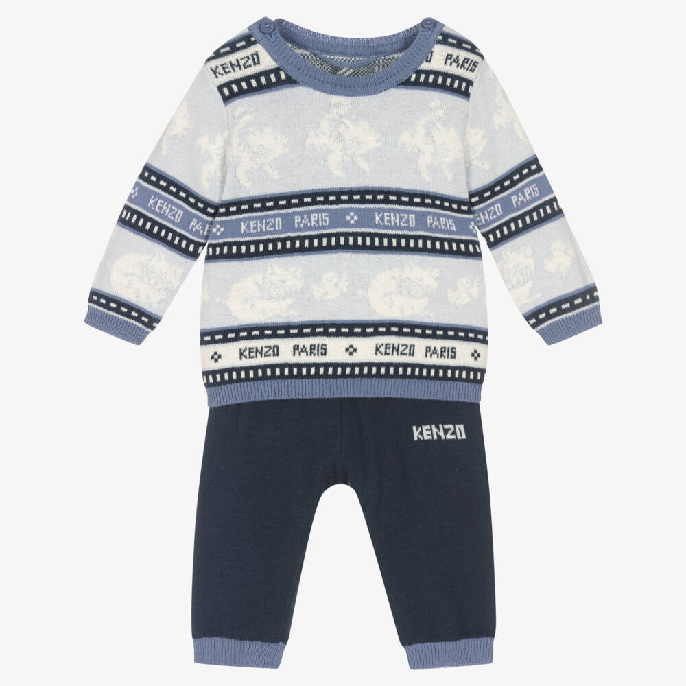Blue trouser set for baby boys from French label KENZO KIDS, knitted in super-soft organic cotton. The sweater has a sweet branded jacquard design, with red pandas and the iconic Tiger in shades of blue. It fastens with useful buttons on the shoulders to help with dressing. The trousers have contrast ribbing on the cuffs, an intarsia Kenzo logo and a gently elasticated waist.